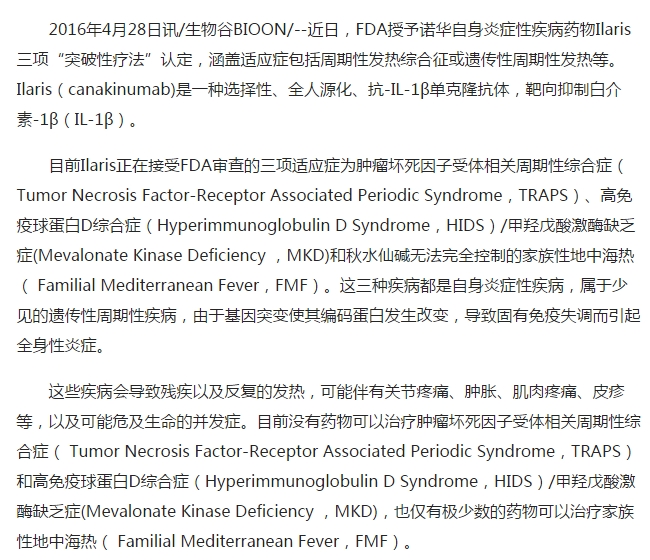 喜大普奔!諾華自身炎癥性疾病藥物Ilaris三項適應癥獲FDA突破性療法認定!