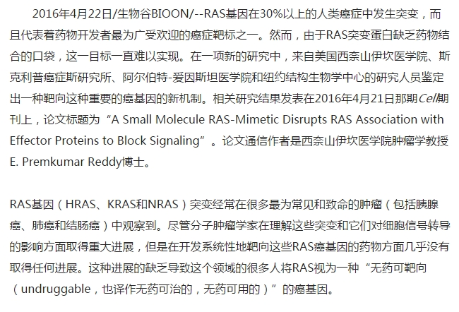 Cell:重大突破!首次鑒定出抑制RAS癌基因的小分子